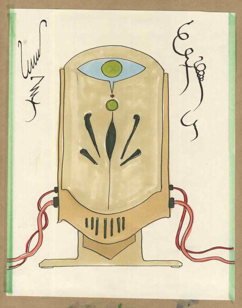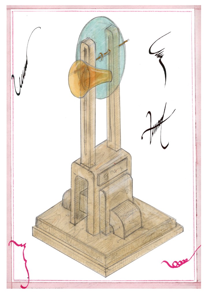 Celesta, con sus cuerpos de caoba, tiene detalles perfilados en sus volumetrías, así como el grabado fino de la caligrafía cetácea1 que la decora. La caoba es el cálido albergue y sólido pie de la obra, y los conos y discos de cobre son los amplificadores y canalizadores de sus sonidos.