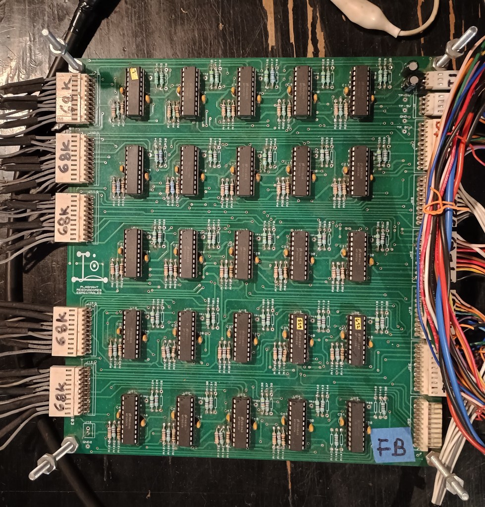 Las señales son amplificadas y finalmente entregadas a un juego de excitadores electromagnéticos y piezoeléctricos de los discos, cuya respuesta es retroalimentada al sistema y visualizada en un cinescopio para su apreciación visual.